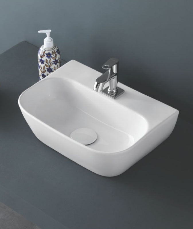 Versatile Design: Orynbath presents "Contra" Table Top & Wall Hung Basin, a ceramic marvel in classic white that effortlessly transitions between table top and wall hung installation, offering flexibility in design.
