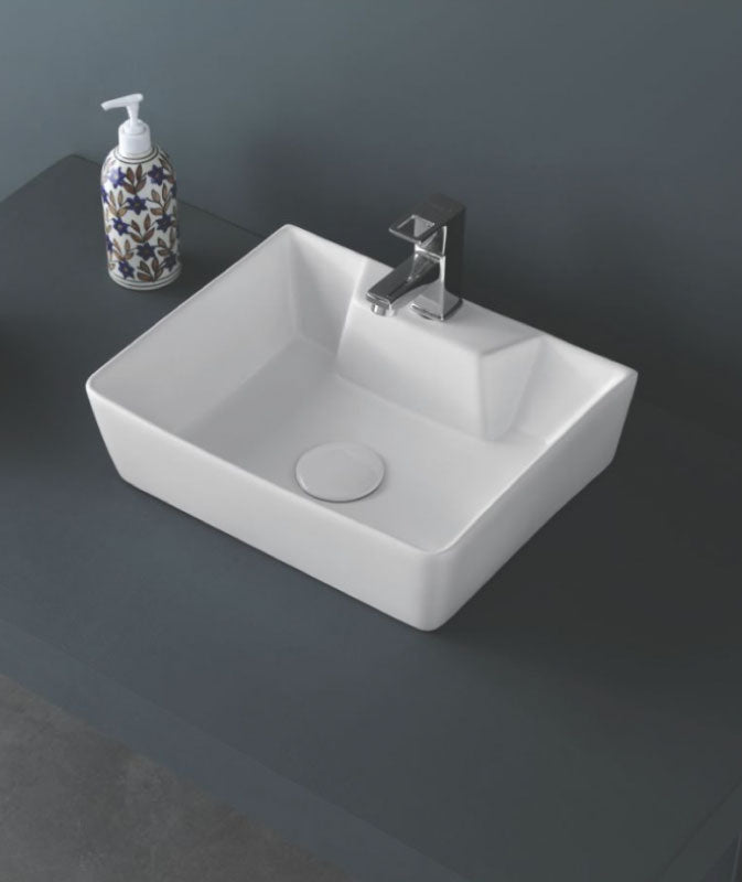 Versatile Design: Orynbath proudly presents the "Trip" Table Top & Wall Hung Basin, expertly crafted from ceramic in timeless white, offering both table top and wall hung installation options for versatile design solutions.