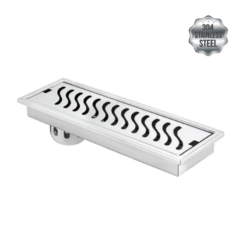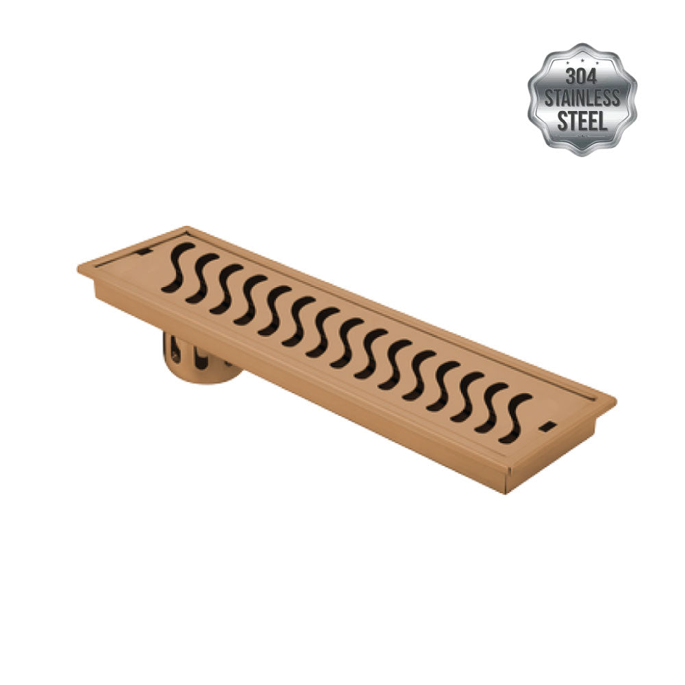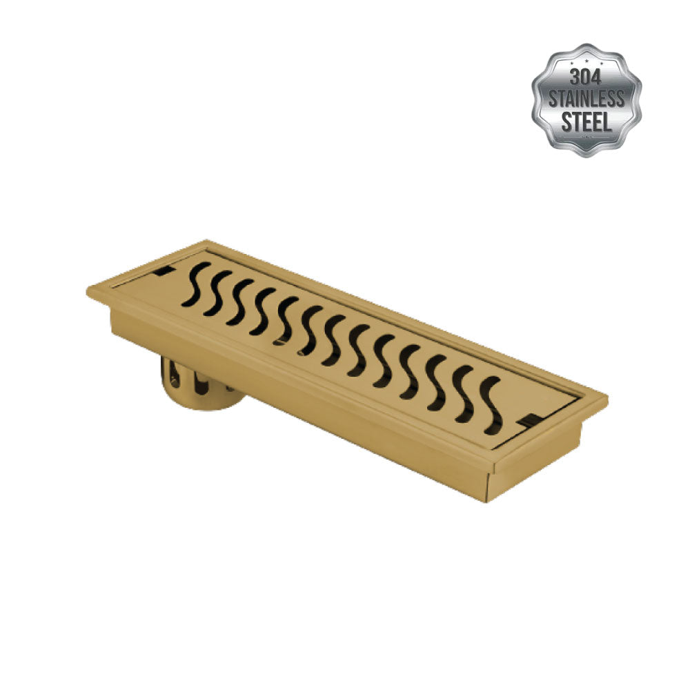 Introducing Our Premium Bathroom Drain Channel: Drain Material: SS304 Cockroach Trap Material: SS304 Finish: Gold PVD Finish Outlet Size: 4 inches Available Channel Sizes: 12", 18", 24" and 36" Automatic Closing Anti-Foul Cockroach Trap: Prevents foul smells and reverse water flow caused by cockroaches Hefty and Nice Design: Heavyweight bearing with a wave design ...
