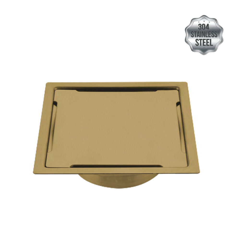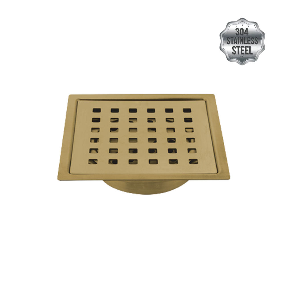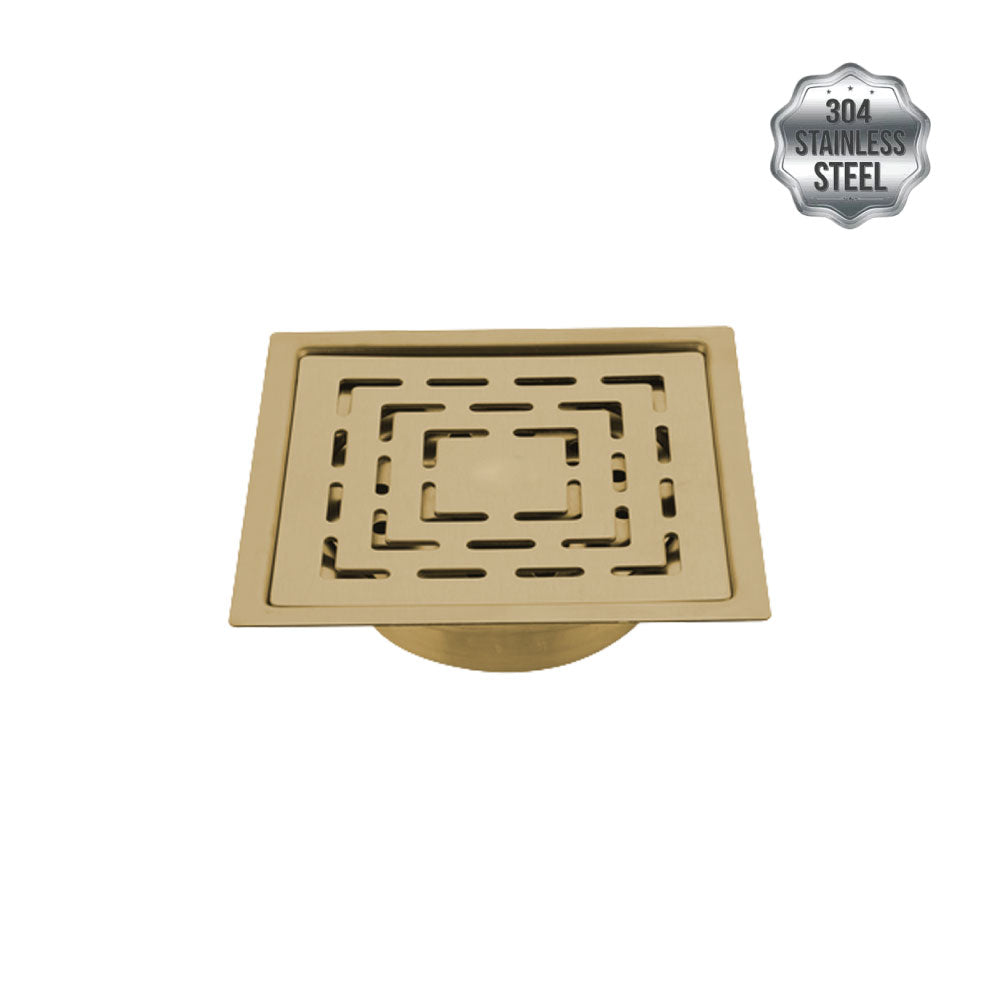 Material & Finish:-AISI 304-Grade Stainless Steel Construction-Non-Corrosive & Rust-Resistant Qualities-Brushed Matte Gold Finish for Modern Appeal-Flat Edges for Easy Installation-Check square cutout pattern of drain coverApplication Area:-Suitable for Drain Pipes 4” and Above-Indoor & Outdoor UseFunctionality:-Modernized Floor Trap Design-Easily Remo ...